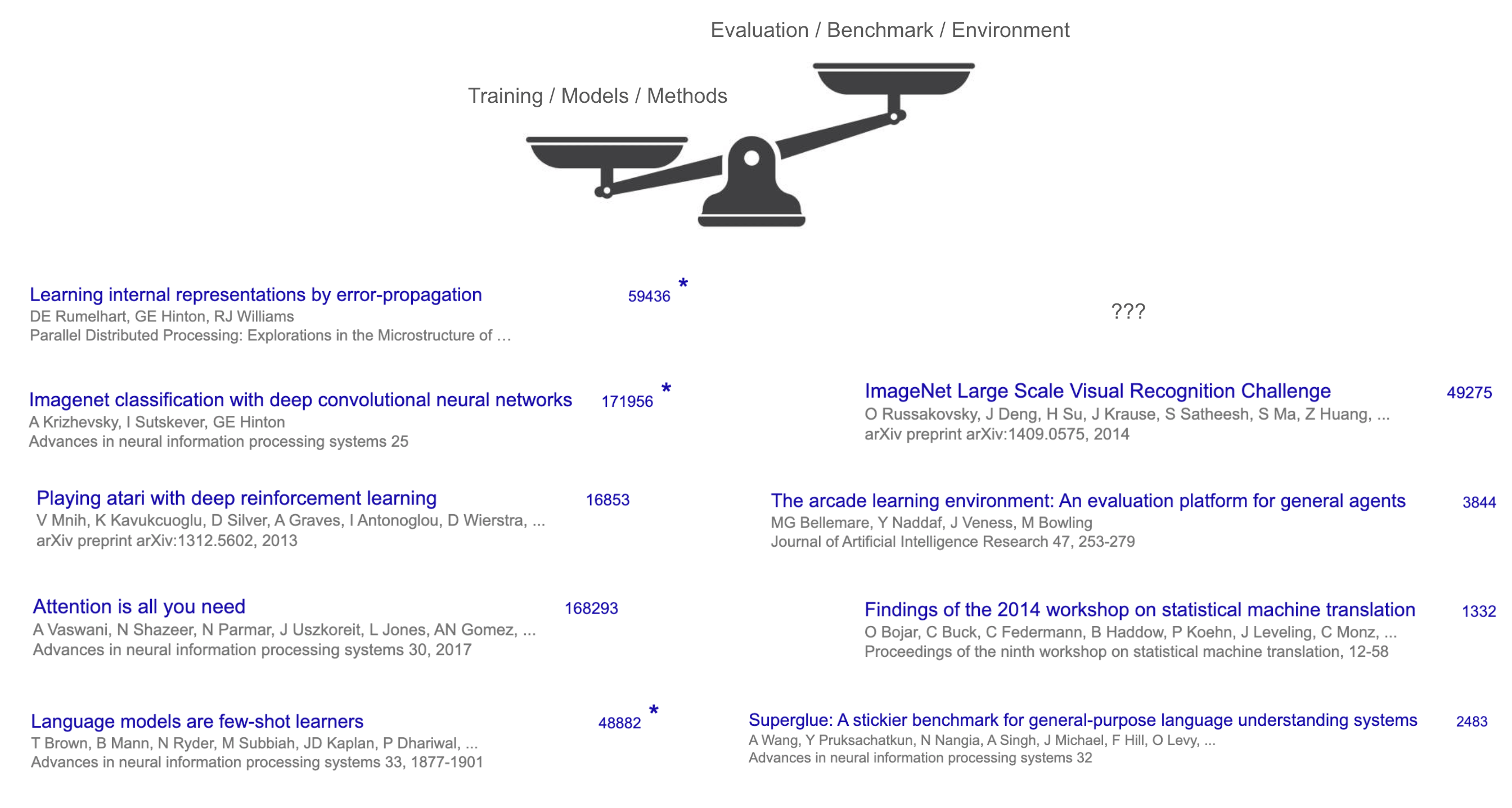 • 即使是最有影响力的基准测试 —— ImageNet —— 其引用量也不及 AlexNet 的三分之一。