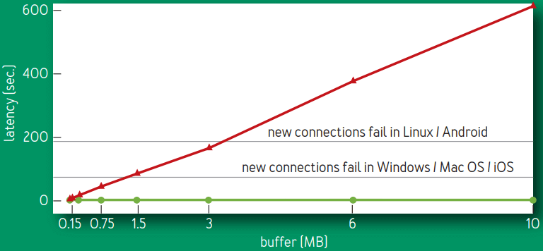 • 当移动设备通过一个大缓冲区的 SGSN 接收大块数据时(例如,手机软件自动更新), 那这个设备就无法连接到互联网上的任何东西,直到队列被清空(SYN-ACK accept packet 被延迟的时间大于固定 SYN timeout)。