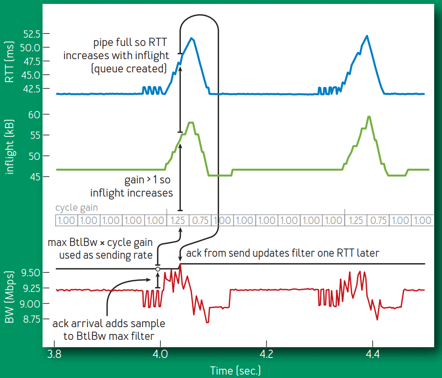 2. 管道填满(full pipe):传输中的总数据(inflight)等于 BDP(= BtlBw × RTprop)。