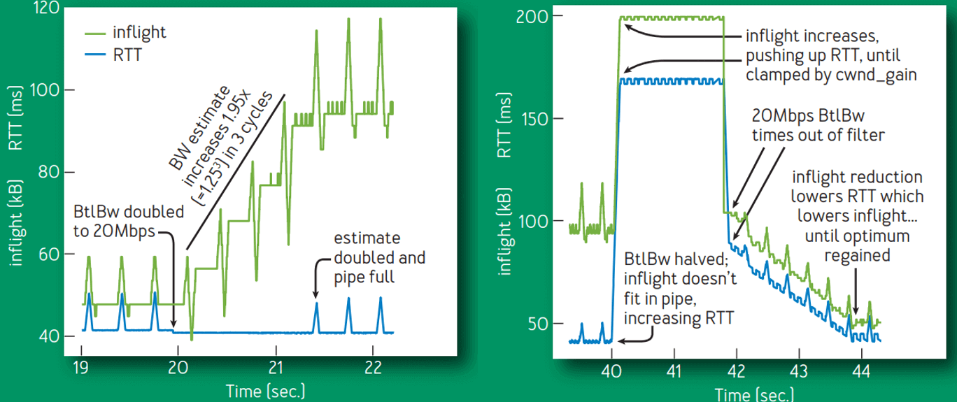 将增大 ProbeBW cwnd_gain 增大到 2 使得 BBR 能在估计的传输速率上持续平稳发送,即使 ACK 被延迟了一个 RTT,这显著避免了卡顿(stalls)。