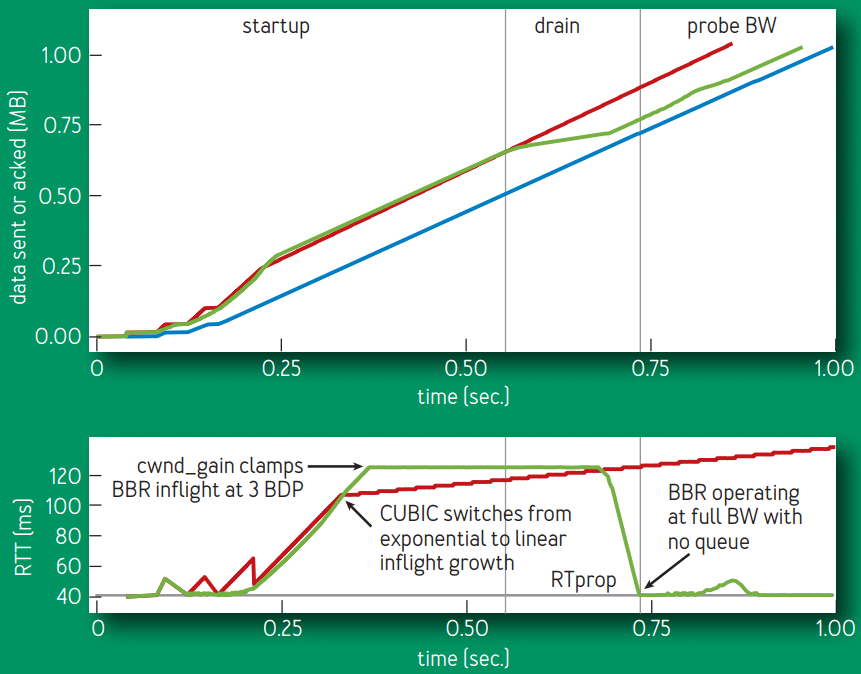 Note that BBR’s Startup and CUBIC’s slow start both explore the bottleneck capacity exponentially, doubling their sending rate each round; they differ in major ways, however. First, BBR is more robust in discovering available bandwidth, since it does not exit the search upon packet loss or (as in CUBIC’s Hystart10) delay increases. Second, BBR smoothly accelerates its sending rate, while within every round CUBIC (even with pacing) sends a burst of packets and then imposes a gap of silence. Figure 4 demonstrates the number of packets in flight and the RTT observed on each acknowledgment for BBR and CUBIC.