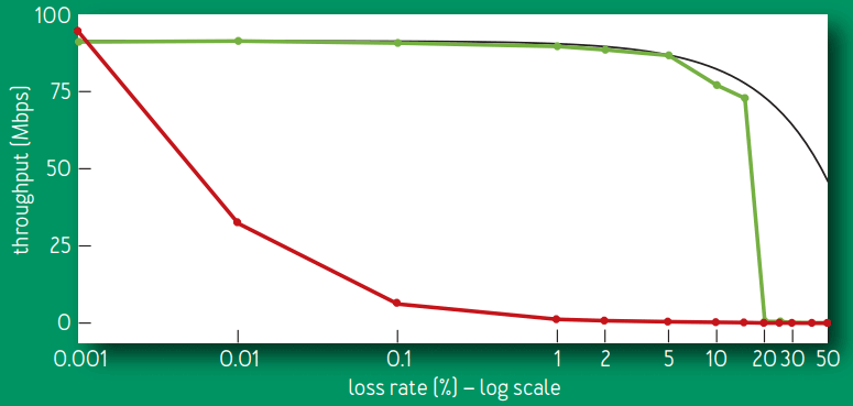 • CUBIC 的吞吐在丢包率 0.1% 时下降到了原来的 1/10 倍,在丢包率 1% 时完全跌零了