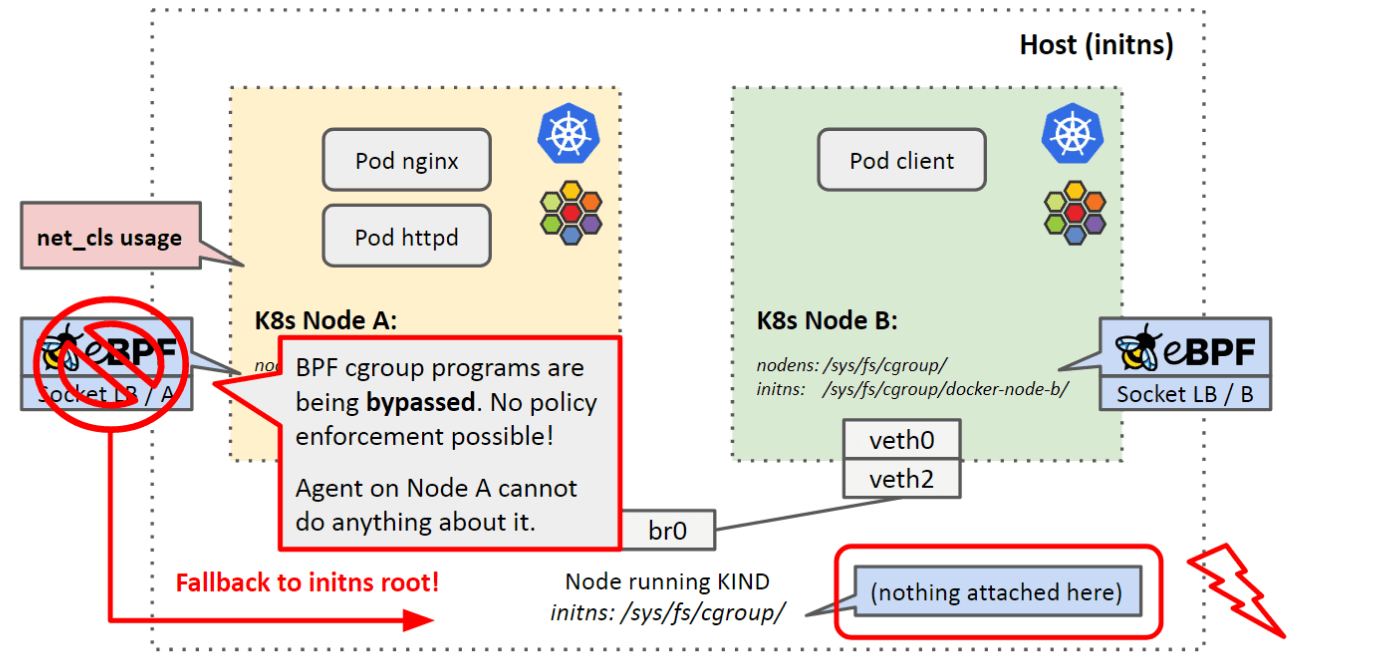 - cilium-agent 会将 BPF 程序加载到它的视角看到的 cgroup root 挂载点(即 k8s-node 中的