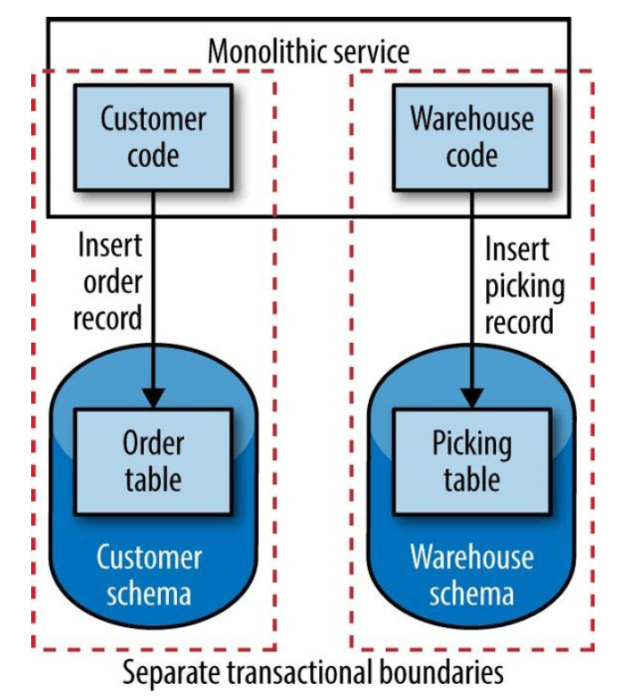 If you do encounter state that really, really wants to be kept consistent, do everything you can to avoid splitting it up in the first place. Try really hard. If you really need to go ahead with the split, think about moving from a purely technical view of the process (e.g., a database transaction) and actually create a concrete concept to represent the transaction itself.