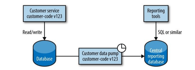 和数据库复制类似,但复制的是文件或其他元数据,存储在对象存储系统中,再用 Hadoop 之类的平台读取文件进行分析。适用于超大规模系统的报表。