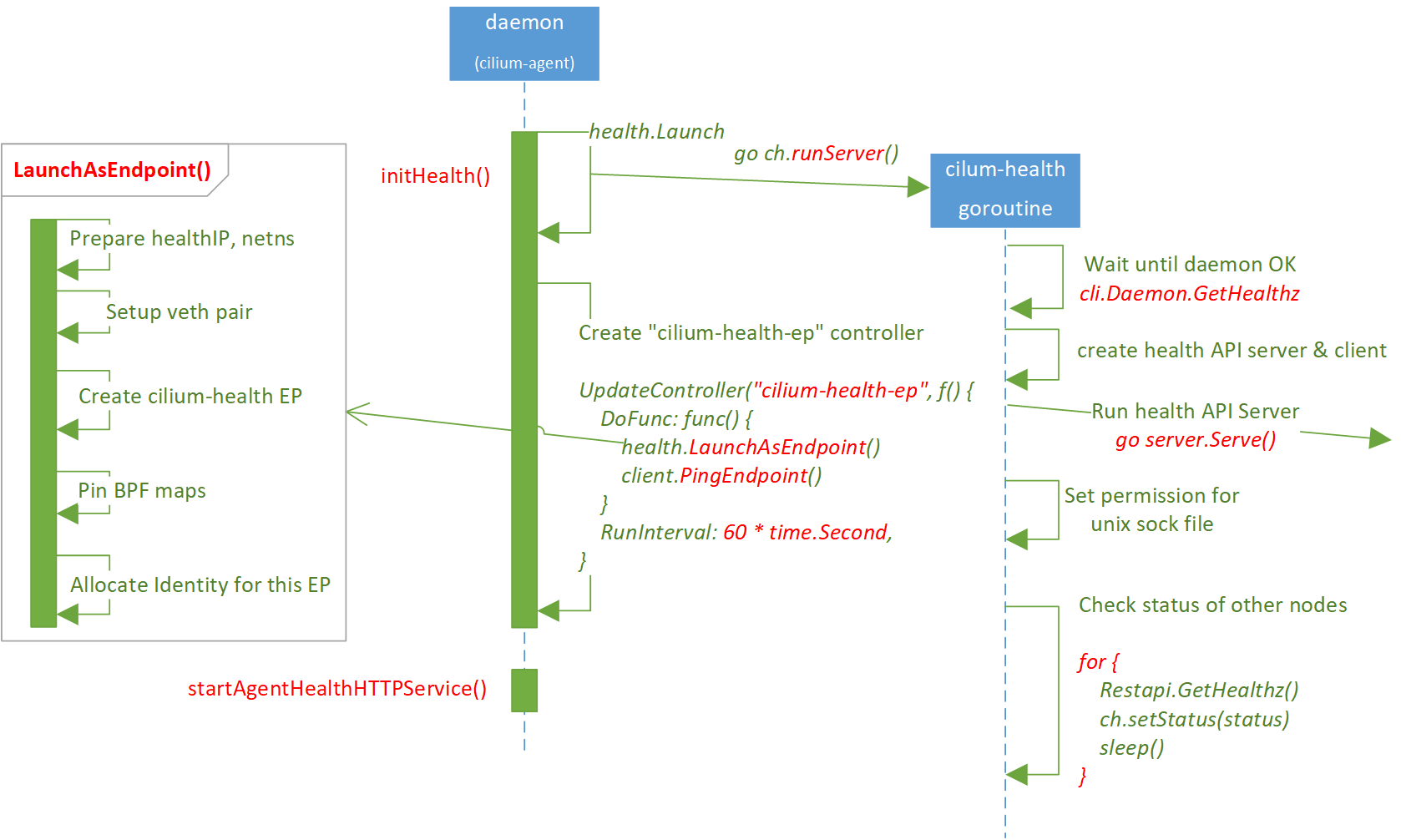 As shown above, creating cilium-health-ep is independent of the steps in section 2.2~2.4 (the latter is asynchronously executed since go runServer()).