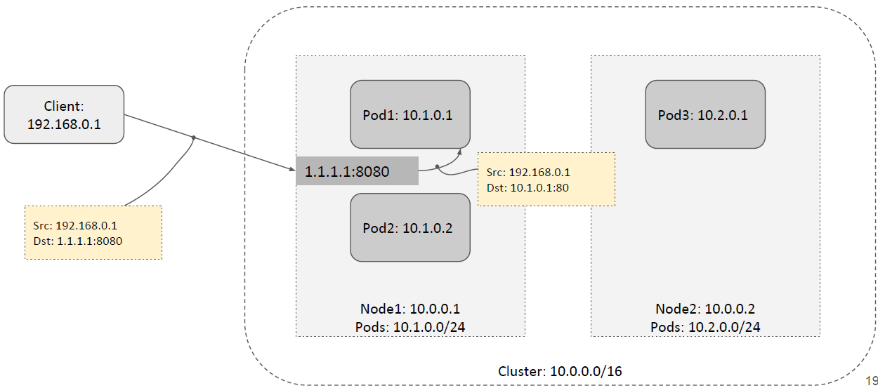 如下图所示,1.1.1.1 是一个 external IP,所有目的 IP 地址是 1.1.1.1 的流量会 被底层的网络(K8s 控制之外)转发到 node1。1.1.1.1:8080 在 K8s 里定义了一个 Service,如果它将流量转发到本机内的 backend pod,需要做一次 DNAT: