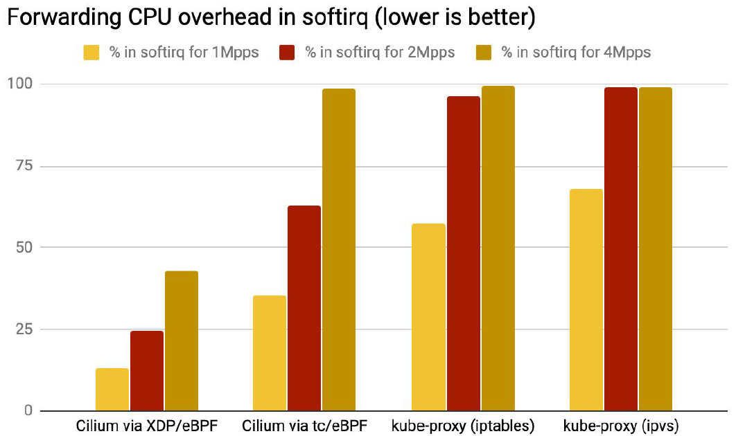 4. kube-proxy IPVS 模式:性能更差一些,因为它的 per-packet overhead 更大一 些,这里测试的 Service 只对应一个 backend pod。当 Service 数量更多时, IPVS 的可扩展性更好,相比 iptables 模式的 kube-proxy 性能会更好,但仍然没 法跟我们基于 TC BPF 和 XDP 的实现相比(no comparison at all)。