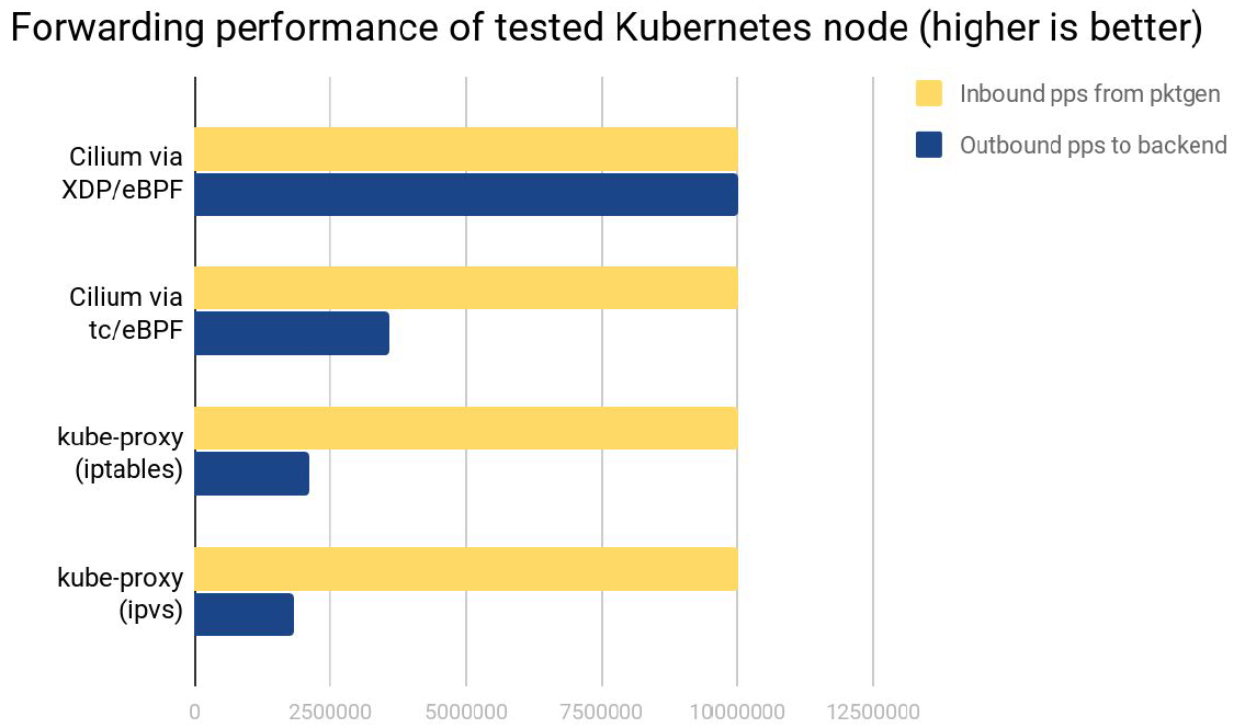 1. Cilium XDP 模式:能够处理全部的 10Mpps 入向流量,将它们转发到其他节点上的 backend pods。