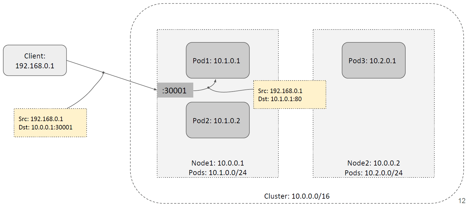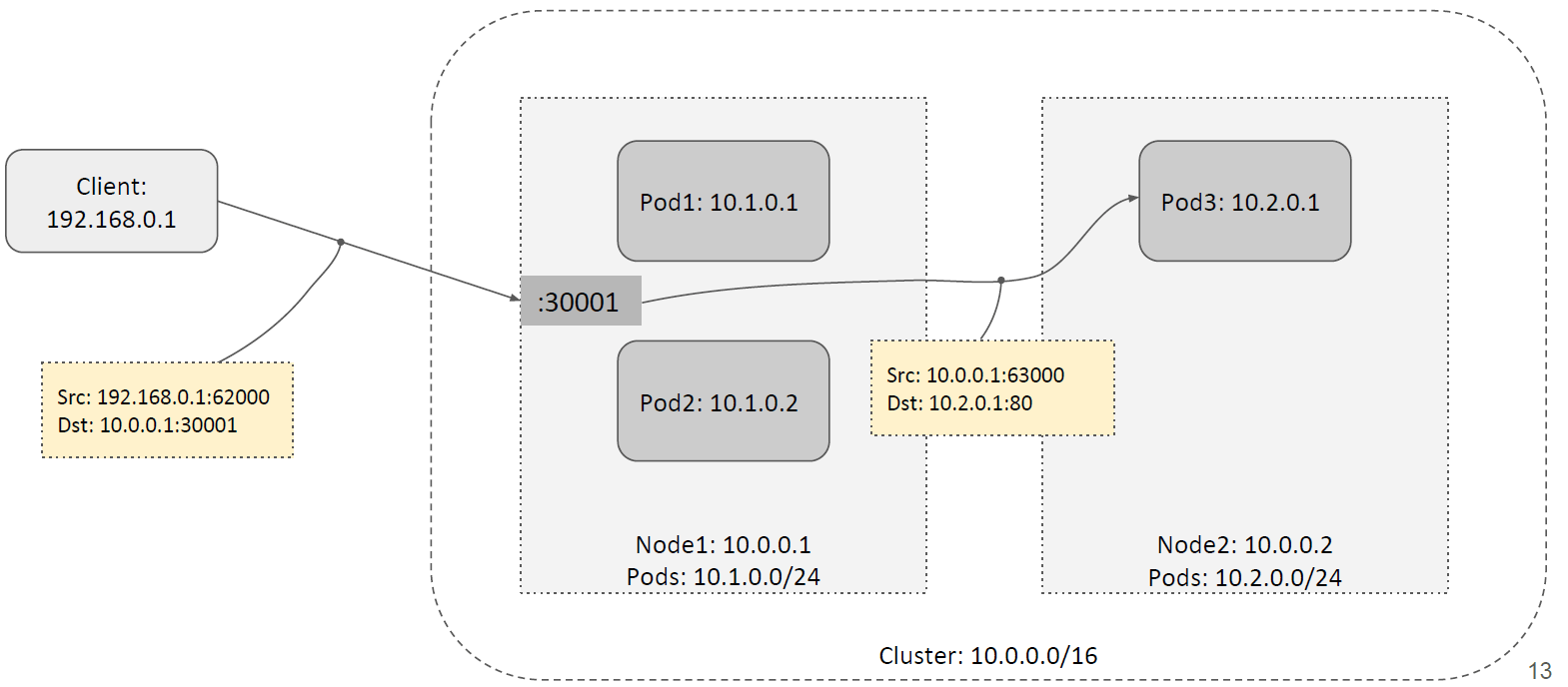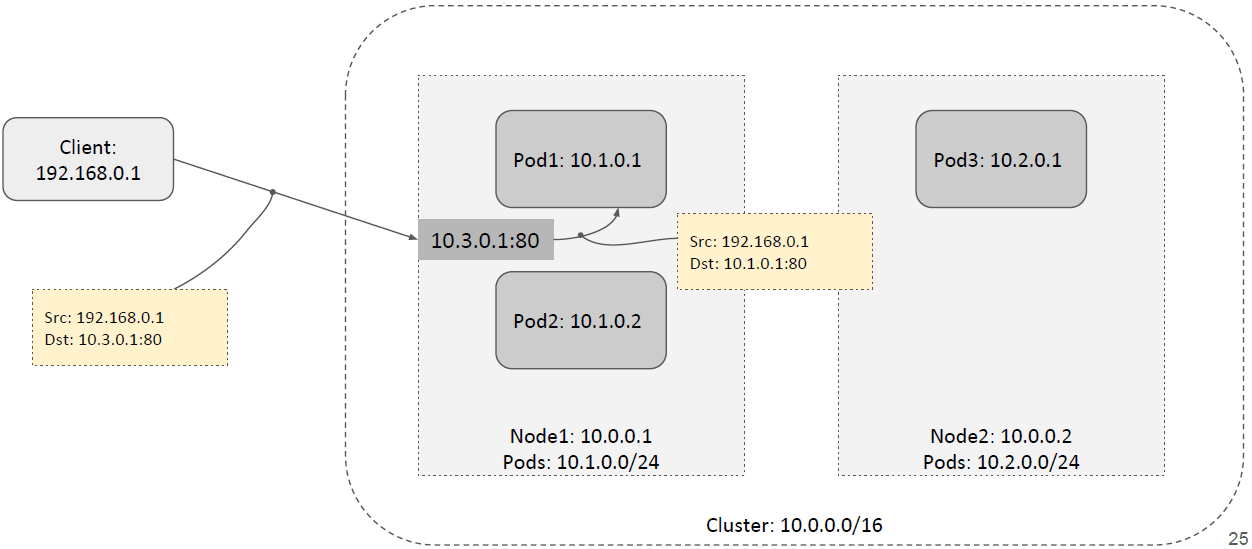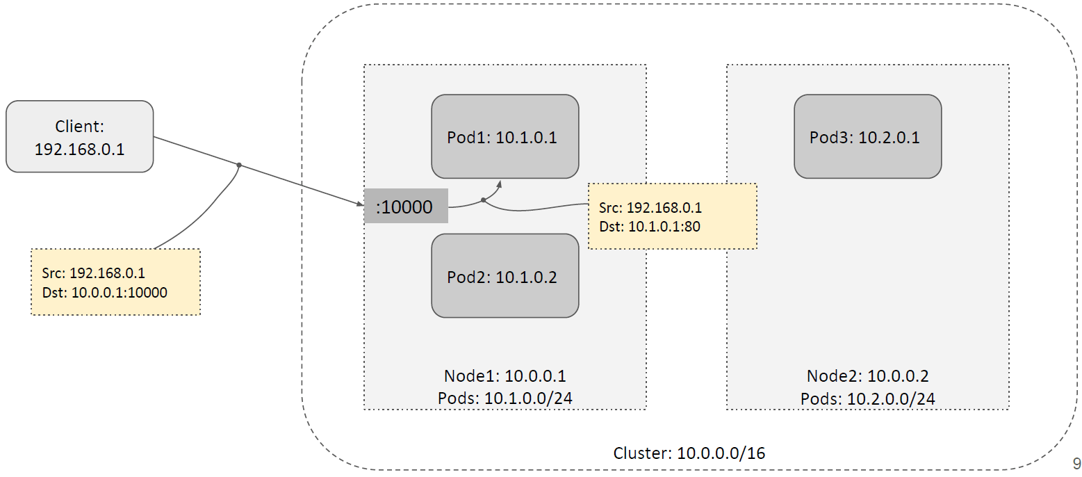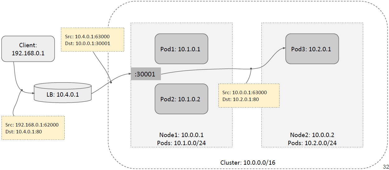 如下图所示,假设这里的 NodePort 是 30001。当客户端请求到达任意一台 node 的 30001 端口时,它可以对请求做 DNAT 然后转发给本节点内的 Pod,如下图所示,