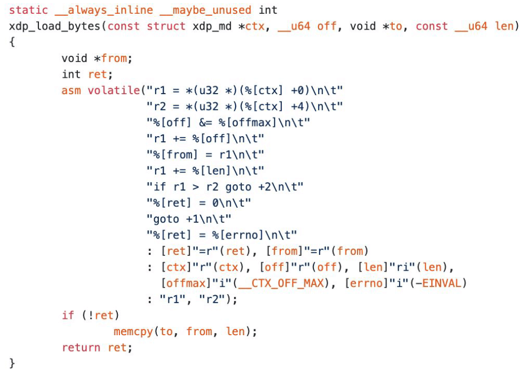 下面是一个具体例子:xdp_load_bytes(),使用下面这段等价的汇编代码,才能 让 verifier 认出来: