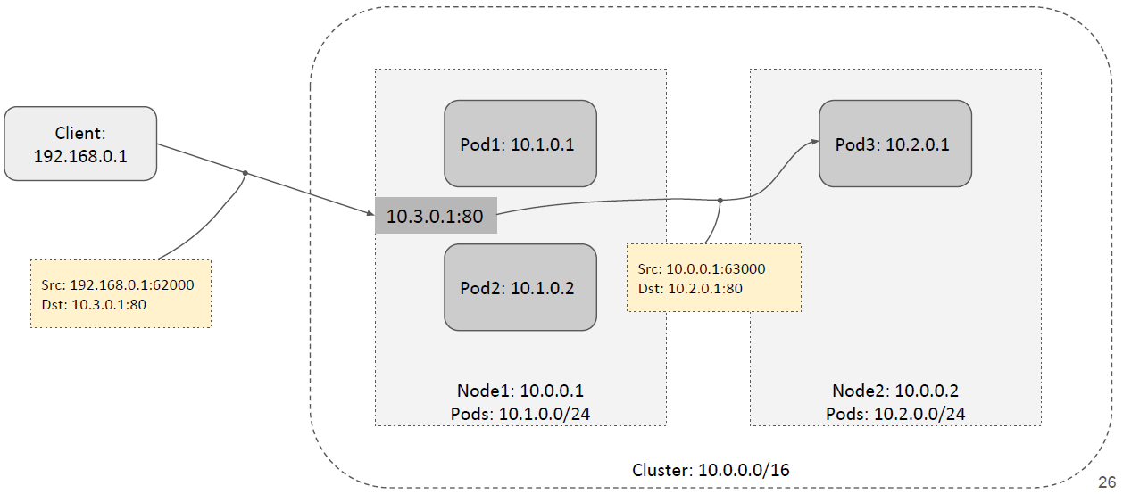 同样,这里的后端 Pod 也可以在其他 node 上,这时除了做 DNAT 还需要做一次 SNAT, 如下图所示: