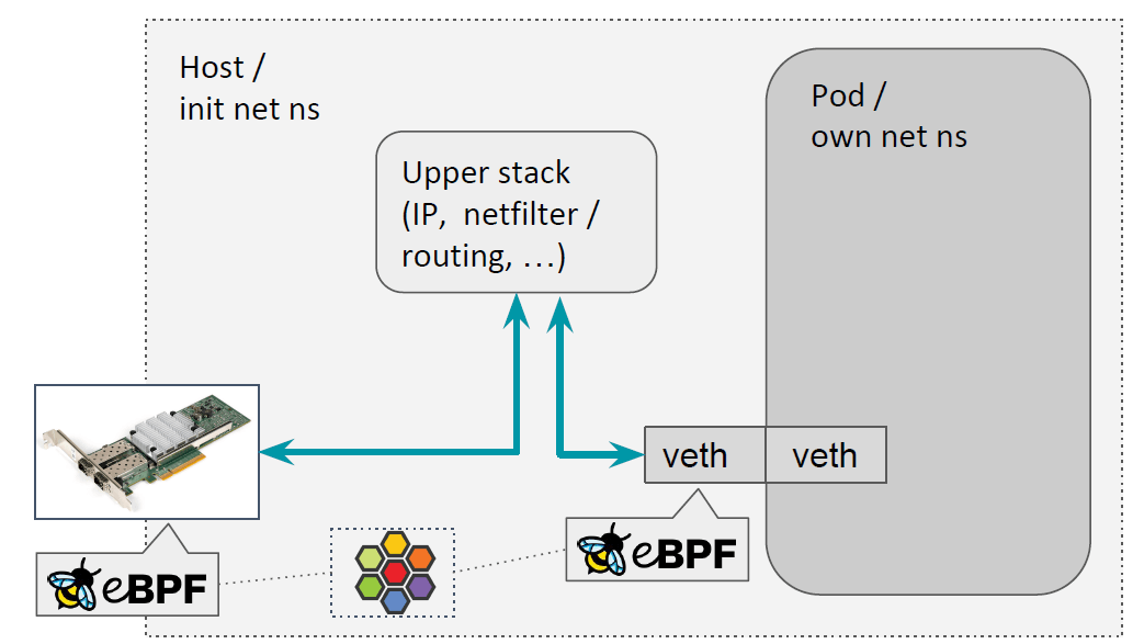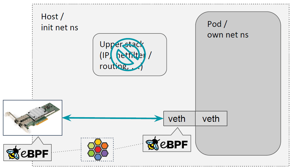 第二种是进出集群的流量,称为南北向流量,在宿主机 tc 或 XDP hook 里处理。