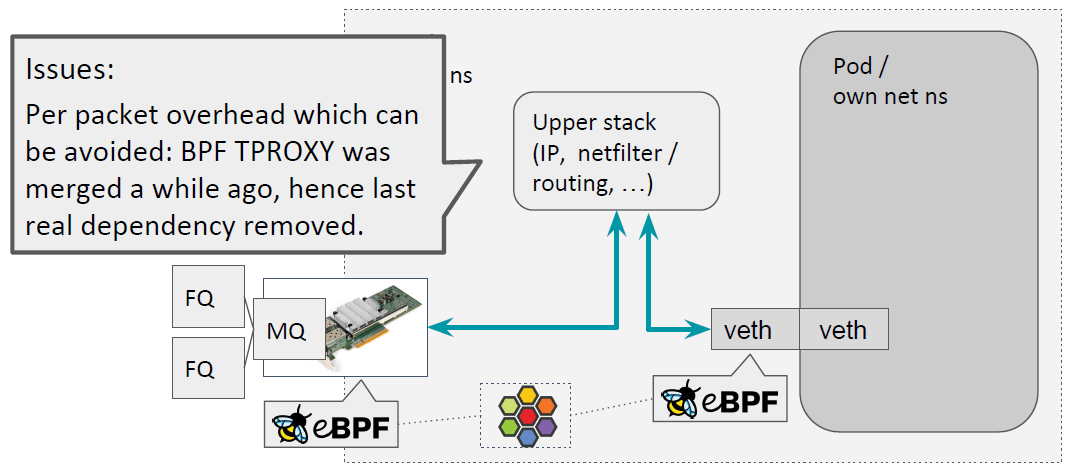 1. Pod 的出向流量在进入协议栈后,在 socket buffer 层会丢掉 socket 信息 (skb->sk gets orphaned at ip_rcv_core()),这导致包从主机设备发出去时, 我们无法在 FQ leaf 获得 TCP 反压(TCP back-pressure)。