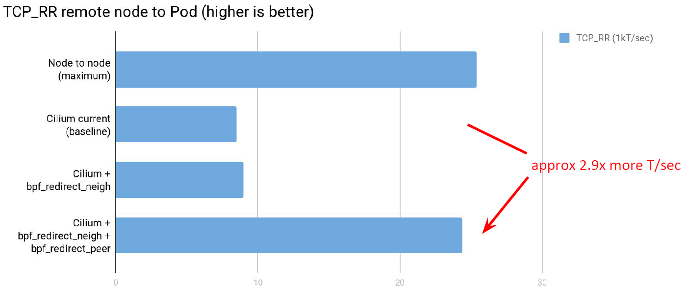 更有趣的是 TCP_RR 的场景,以 transactions/second 衡量,提升了 2.9 倍,接近最 大性能: