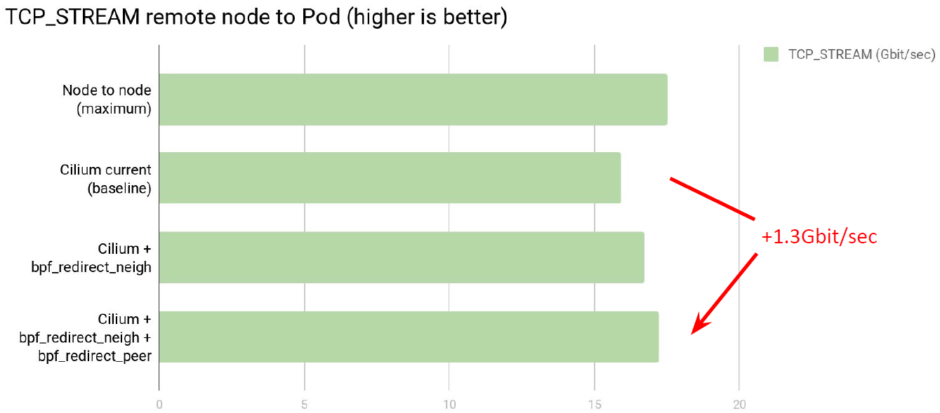 TCP stream 场景,相比 Cilium baseline,转发带宽增加了 1.3Gbps,接近线速: