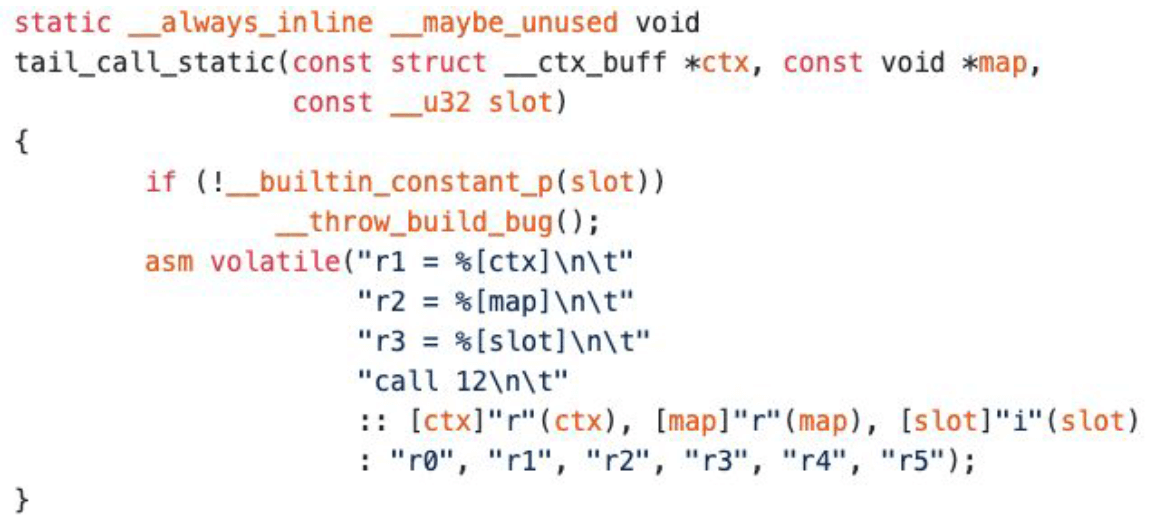我们在 BPF map 的基础上有大量的尾调用,它们有静态的 keys,能够在编译期间确 定 key 的大小。我们还实现了一个内联汇编来做静态的尾递归调用,保证 LLVM 不会出现 尾调用相关的问题。