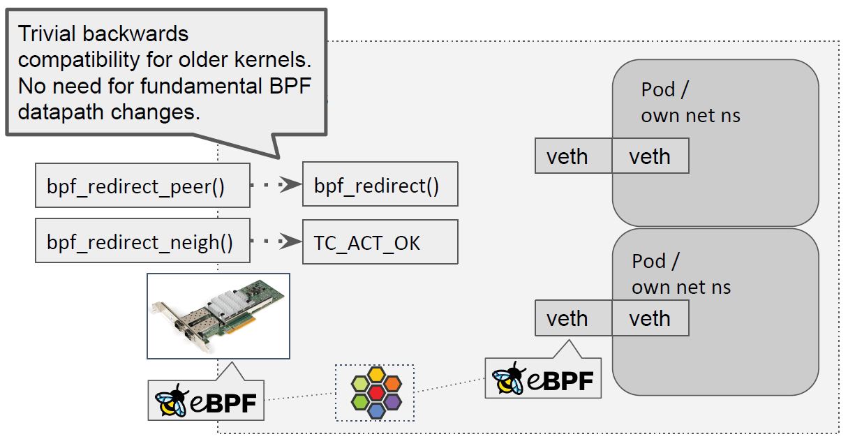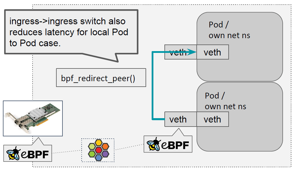 同宿主机上的两个 Pod 之间通信时,这两个 helper 也非常有用。 因为我们已经在主机 netns 的 TC ingress 层了,因此能直接将其 redirect 到另一个容 器的 ingress 路径。