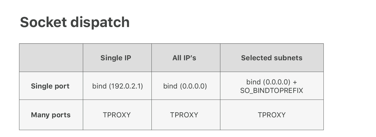 如果使用 “AnyIP” trick,那 让 Linux 正确地对包进行路由是很容易的。但要将包正确地发送到对应的应用,则是另外一回事 。不幸的是,Linux 原生的 socket dispatch 逻辑对我们的需求来说不够灵活。我们希 望 80 这样的常用端口可以被不同应用共享,每个应用运行在不同的 IP 地址范围。Linux 本身并不支持这种功能,bind() 只能针对单个具体 IP,或者所有 IP(0.0.0.0)。