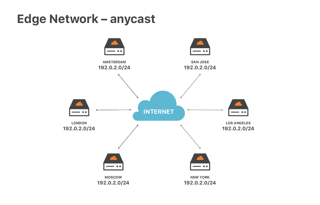 特殊的网络配置——大量使用任播路由(anycast routing)——导致我们的边缘服务器也 很特殊。任播意味着,我们所有的数据中心都通告相同的一组 IP 地址,如上图所示。