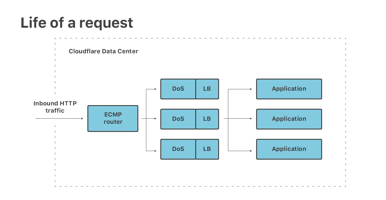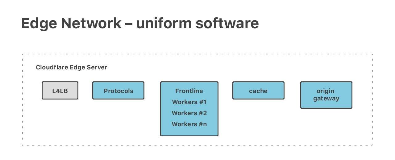 理论上来说,每台机器都可以处理任何任务(every machine can handle every task)。 我们在机器上运行了多种不同功能和不同需求的任务。我们有完整的 HTTP 协议栈、神奇的 Cloudflare Workers、两种 DNS —— 权威 DNS 和解析 DNS,以及其他对外的服务,例如 Spectrum 和 Warp。