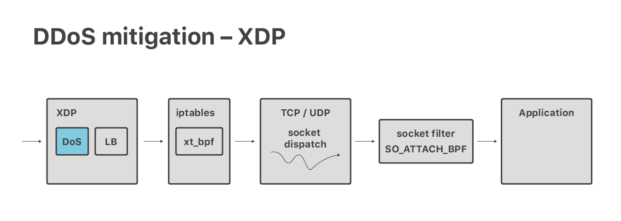 前面说到,ECMP 路由之后会到 Linux XDP,这里会做一些包括 DDoS 防御在内的处理。