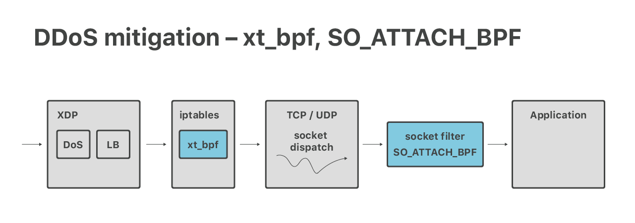 虽然我们的现代大规模 DoS 防御系统是在 XDP 层做的,但我们的 7 层(应用层)防御目前 还是依赖 iptables。在应用层,更高级别防火墙的一些特性会带来很大帮助:connlimit、 hashlimits 和 ipsets。我们也用到了 xt_bpf iptables 模块,以在 iptables 内运行 cBPF 匹配 packet payload。下面两个分享中介绍了这部分工作: