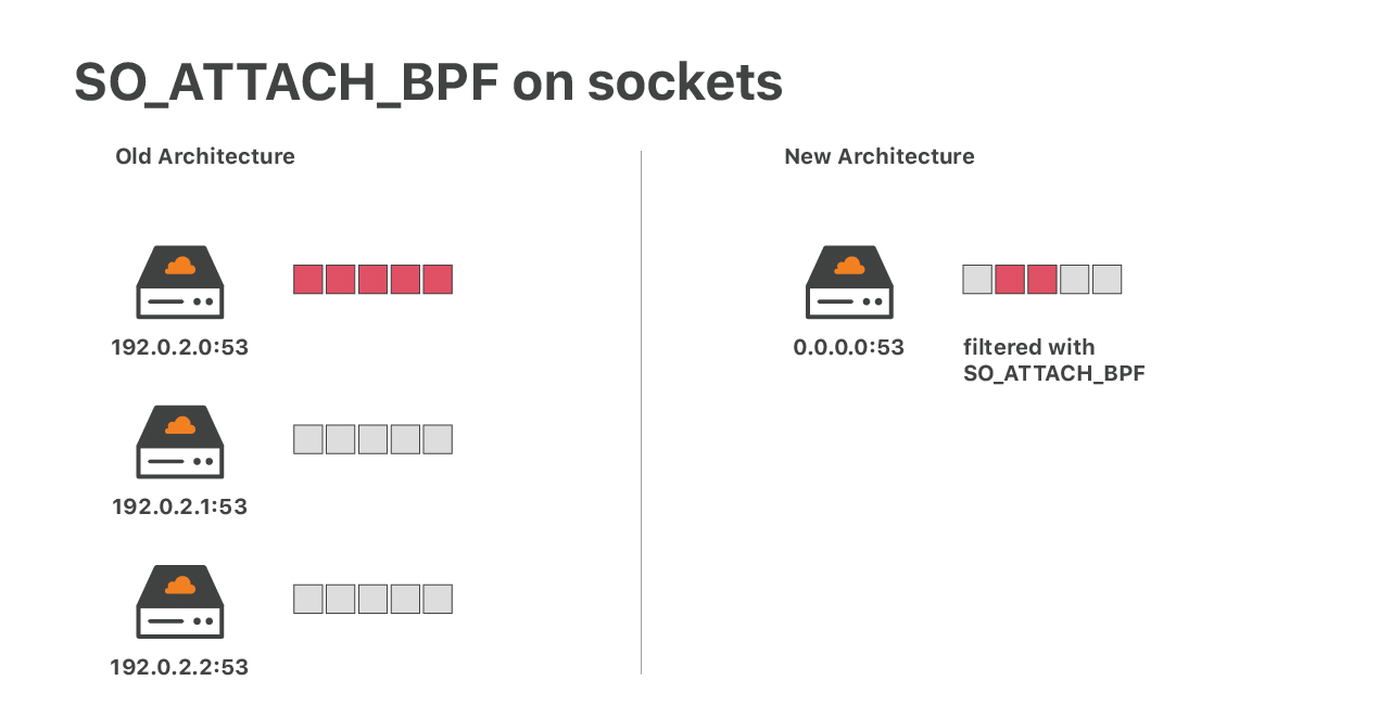 现在这一方式很难奏效了:我们有 30K+ DNS IP,运行同样数量的 UDP socket 显然不合理 。因此,我们的新方案是:使用 SO_ATTACH_BPF 选项,在每个 UDP socket 上运行一 个(复杂的)eBPF 过滤器 。关于在 socket 上运行 eBPF 的内容,参考我们的分享: