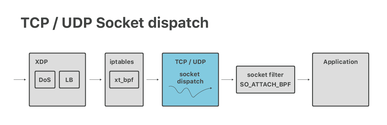 经过了 DoS 和 LB 层之后,数据包来到了常规的 Linux TCP/UDP 协议栈。这里是进行 socket dispatch 的地方,例如,端口是 53 的包会被发送到 DNS 服务器。