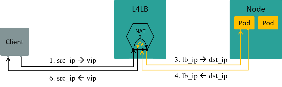 If L4LB uses NAT mode (between VIP and Real IPs), L4LB will perform full NAT between client-server traffic, the data flow depicted as picture below:
