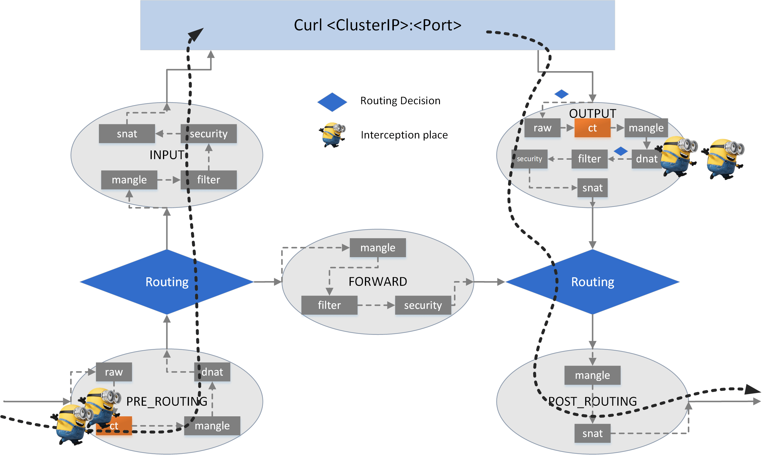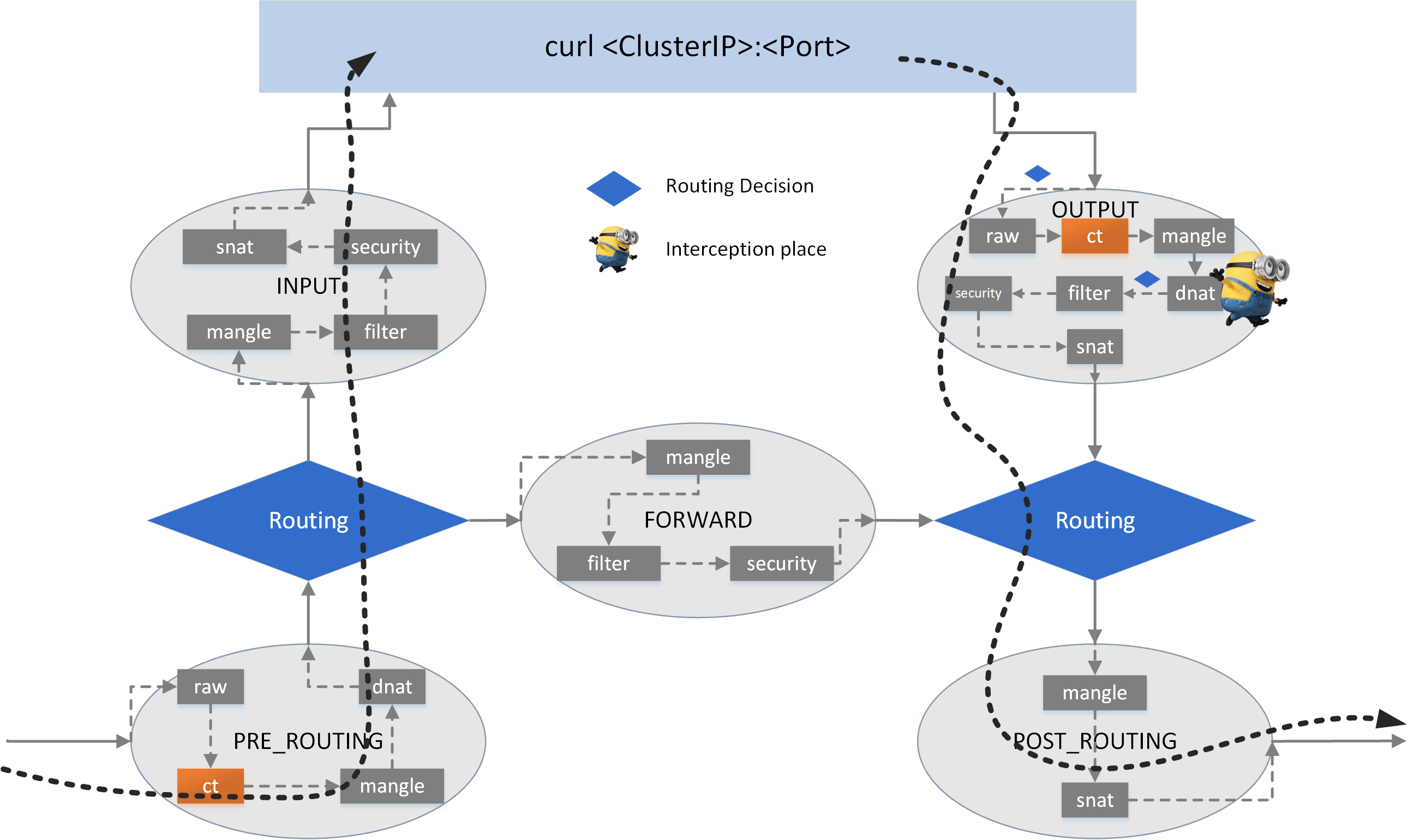 <Protocol,ClusterIP,Port>tuple uniquelly defines a Service (and thus an interception rule). For example, if a Service is defined as<tcp,10.7.0.100,80>, then the node proxy is only responsible for handling traffic oftcp:10.7.0.100:80, other traffics, eg.tcp:10.7.0.100:8080,udp:10.7.0.100:80are out of its duties. Thus the ClusterIP would not be reachable (ping traffic is ICMP).But if you are using kube-proxy with IPVS mode, the ClusterIP is indeed reachable via ping. This is because the IPVS mode implementation does more than what is asked. You will see the differences in the following sections.