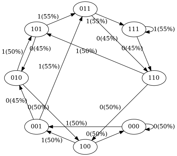 • 101 总是转换为 011:经过 50 次训练之后,我们看到这种转换有 79% 的概率;