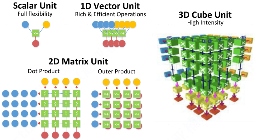 2017 年发布了自己的 NPU 架构,[2] 详细介绍了 DaVinci 架构的设计。 除了支持传统标量运算、矢量运行,还引入了 3D Cube 来加速矩阵运算,