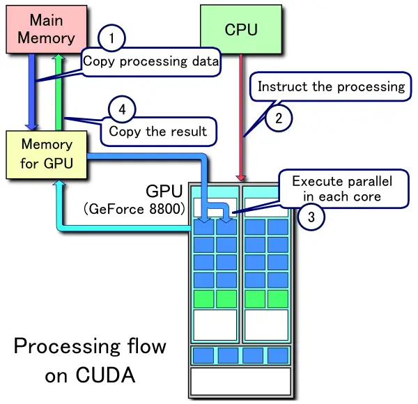 大部分芯片面积用在了计算单元,因此并行计算能力强,但逻辑控制弱。 适合图像渲染、矩阵计算之类的并行计算场景。作为协处理器, 需要在 CPU 的指挥下工作,