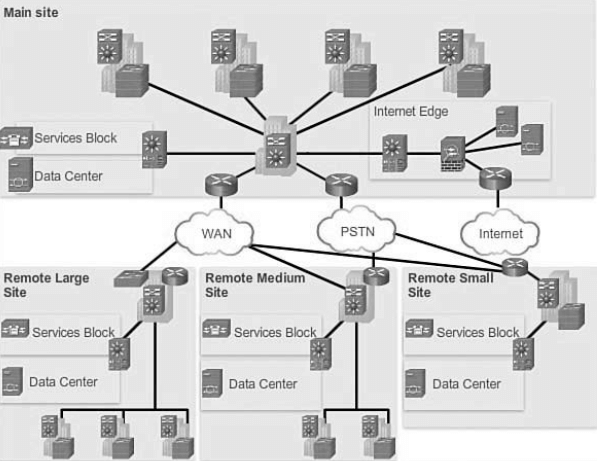网络设计需要考虑很多变量。例如,图 1-1 是一个由主 site 构成的大型企业网络连接小型、 中型、大型 site 的高层拓扑示例。