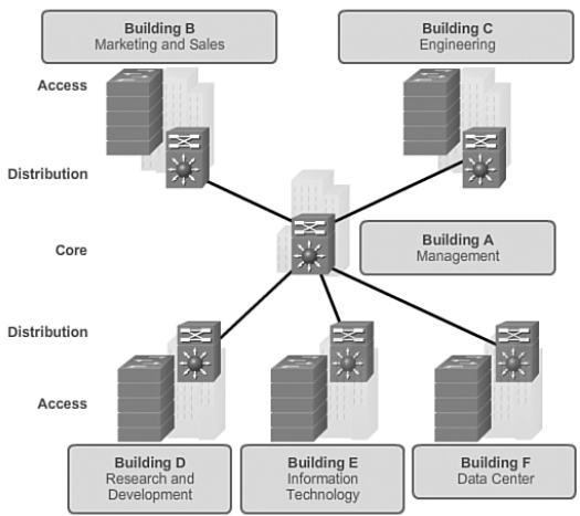 另一个三级分层网络设计如图 1-4 所示,注意其中的每个 building 都是分层网络模型 ,包括了接入层、分发层和核心层。