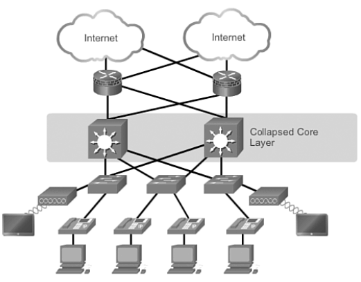 然而,很多小型企业网络并不会随着时间变的很大。因此,一种将核心层和分发层合并 的两层设计(two-tier hierarchical design)就更加实际。“collapsed core”(塌缩核心 层)就是核心层和分发层合并,由同一个设备实现其功能。这种设计的主要目的就是 保留三级模型的大部分好处的同时,降低网络成本