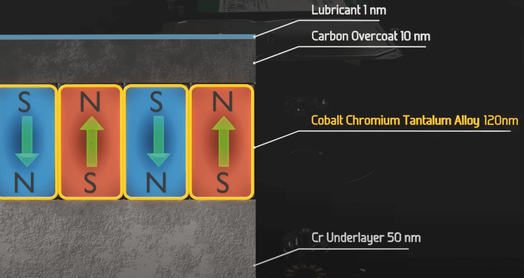 120nm的钴铬钽合金薄层(cobalt chromium tantalum alloy), 它由磁性微块组成,磁极方向能变,