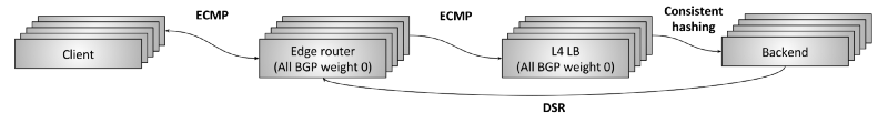 - 然后使用 DSR 将应答包从后端直接发送到边缘路由器,最后到客户端