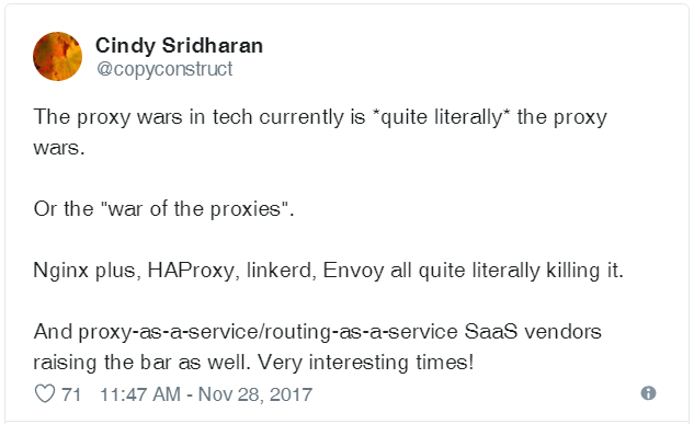 是的,的确如此。过去几年见证了 L7LB/Proxy 的一阵复兴(resurgence)浪潮, 紧跟了分布式系统微服务化的发展趋势。本质上,当使用更加频繁时, 天生有损的网络(inherently faulty network)越来越难以有效运维。而且,自动扩缩容、 容器调度器等技术的崛起,意味着通过静态文件配置静态 IP 的方式早就过时了。系统不 仅使用网络更加频繁,而且使用的方式越来越动态,需要负载均衡器提供更多的功能。