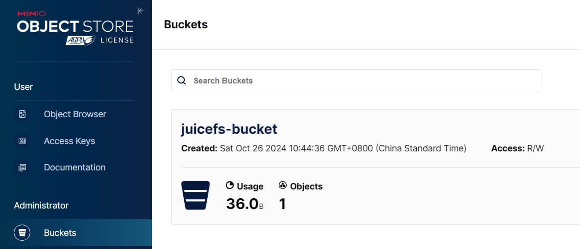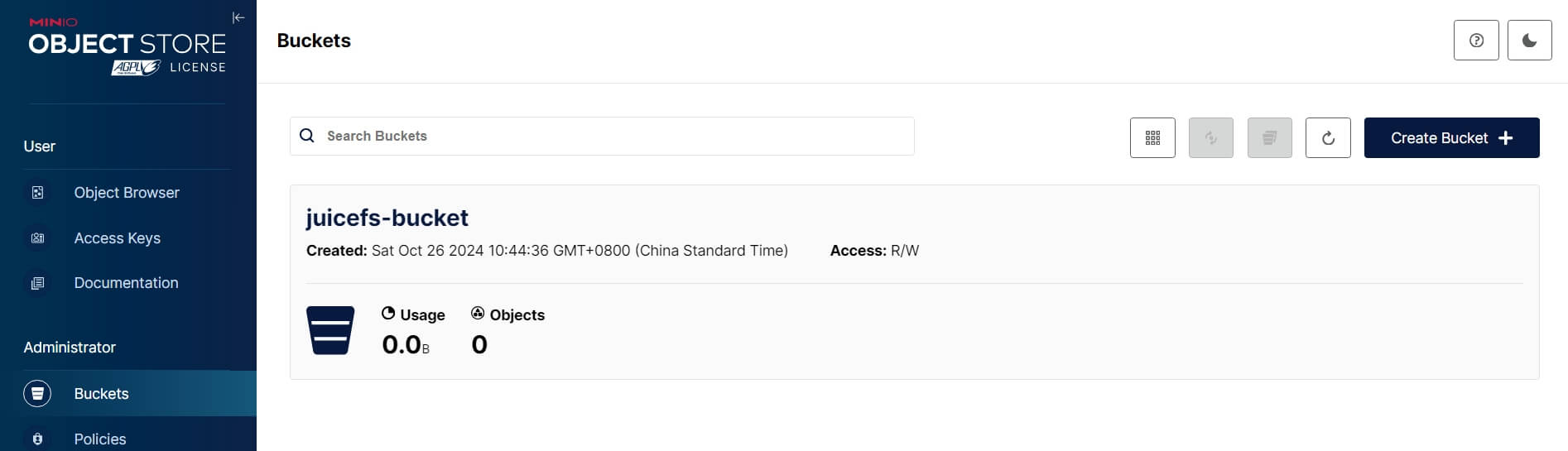 通过 MinIO 管理界面创建一个 bucket,这里我们命名为 juicefs-bucket,