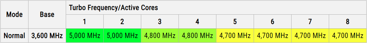 3.6GHz, - 超频到 5GHz 时,最多只有 2 个核能工作在这个频率;