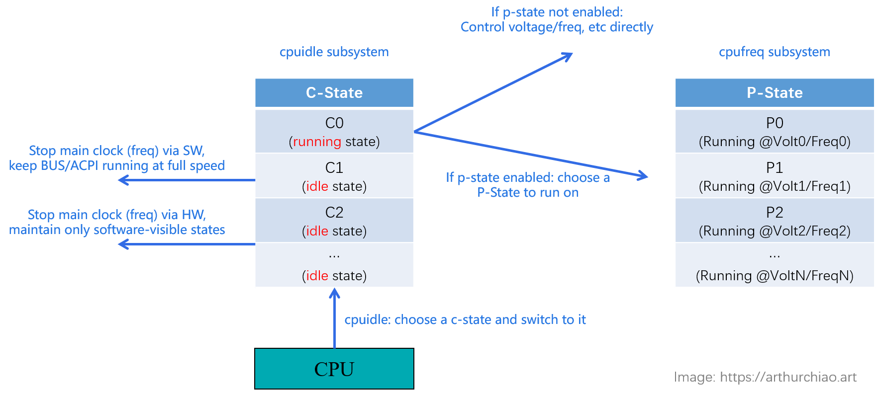 处理器硬件有接口暴露给内核,可以设置 CPU 的运行 frequency/voltage,或者说选择不同的 P-state.