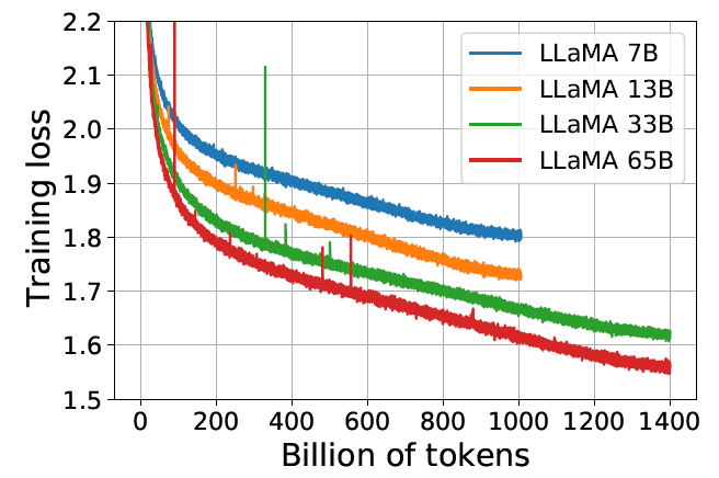 - 对于一个给定的性能要求,训练一个大模型(a large model)可能是一种更便宜的方式; 但对于最终的推理来说,较小的模型+更长的训练时间(a smaller one trained longer)反而更实惠。 例如,Hoffmann 等(2022)建议用 200B tokens 来训练 10B 模型,但我们发现即使在 1T 个 token 之后,7B 模型的性能仍在随着 token 的增多而提高。