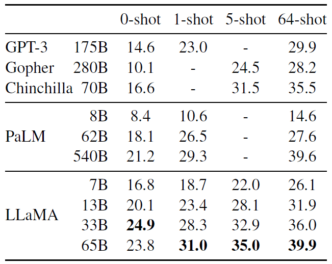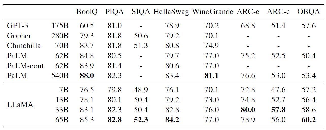 ,而 LLaMA-65B 则与最佳模型 Chinchilla-70B 和 PaLM-540B 相当。