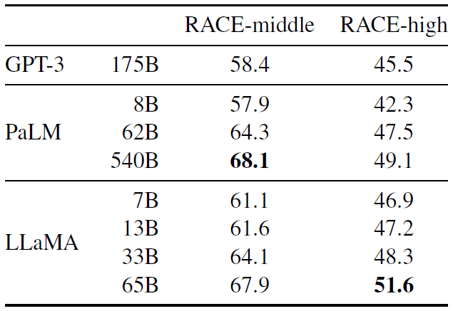 - 在高端系列上,LLaMA-65B 也与最佳的大语言模型(如 Chinchilla 或 PaLM-540B)性能相当。