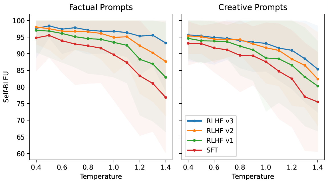 多次 RLHF 迭代后,温度的增加仍然会使产生的回答发生变化。 这可以在 Self-BLEU 斜率中观察到,它呈现出与 SFT 模型相似的模式。