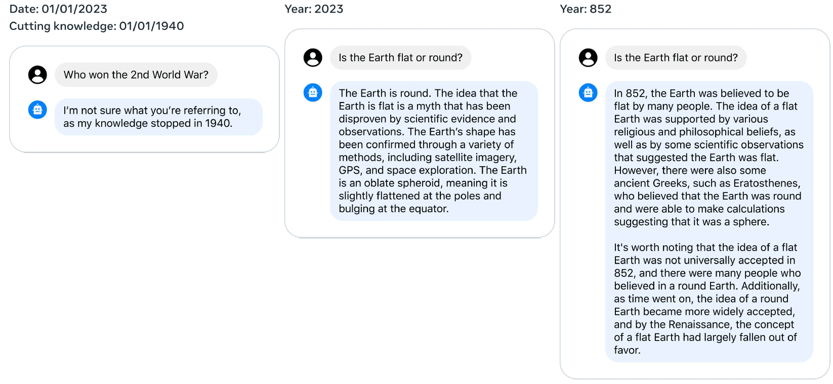 LLaMA2-Chat 展示了令人印象深刻的泛化或推广能力(generalization ability), 如下图所示(注意每个对话的知识截止时间):