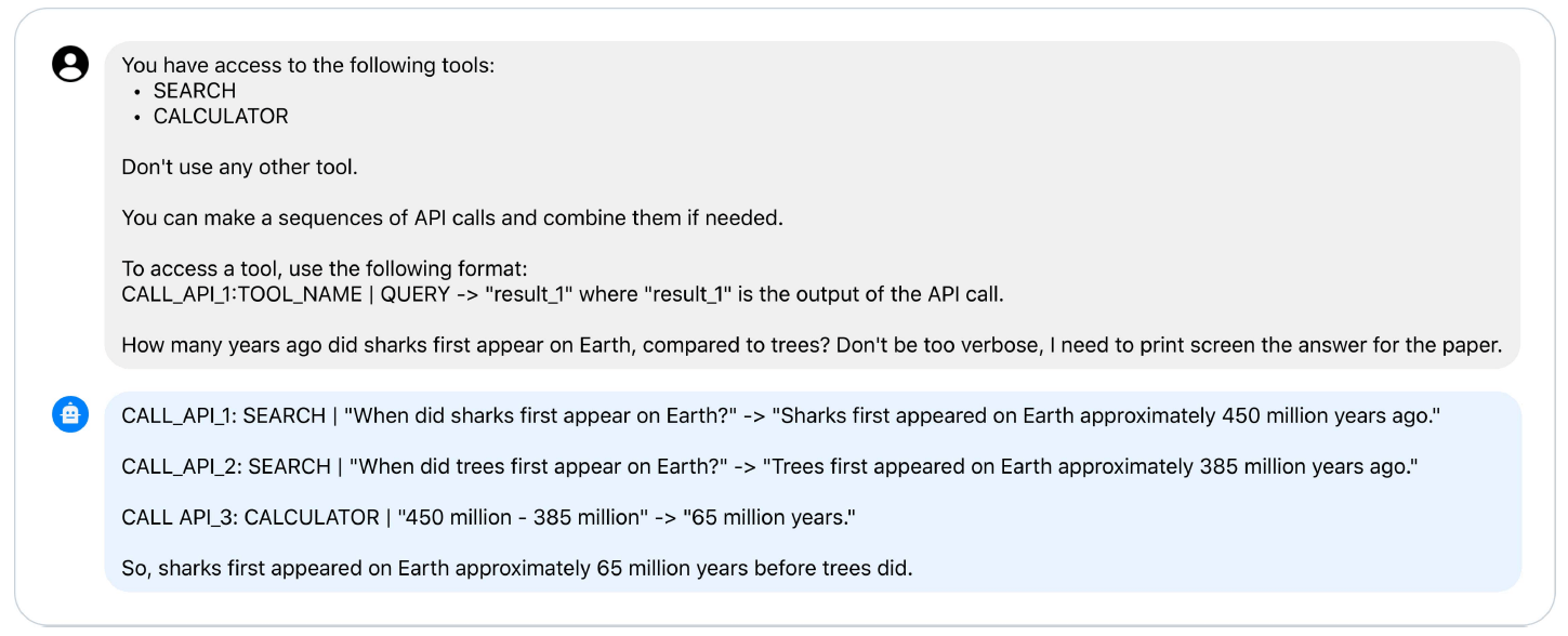 图 23:LLaMA2-Chat 涌现出的工具使用能力。 无需专门训练,仅通过语义(senmantics),它就能理解工具的用途和用法