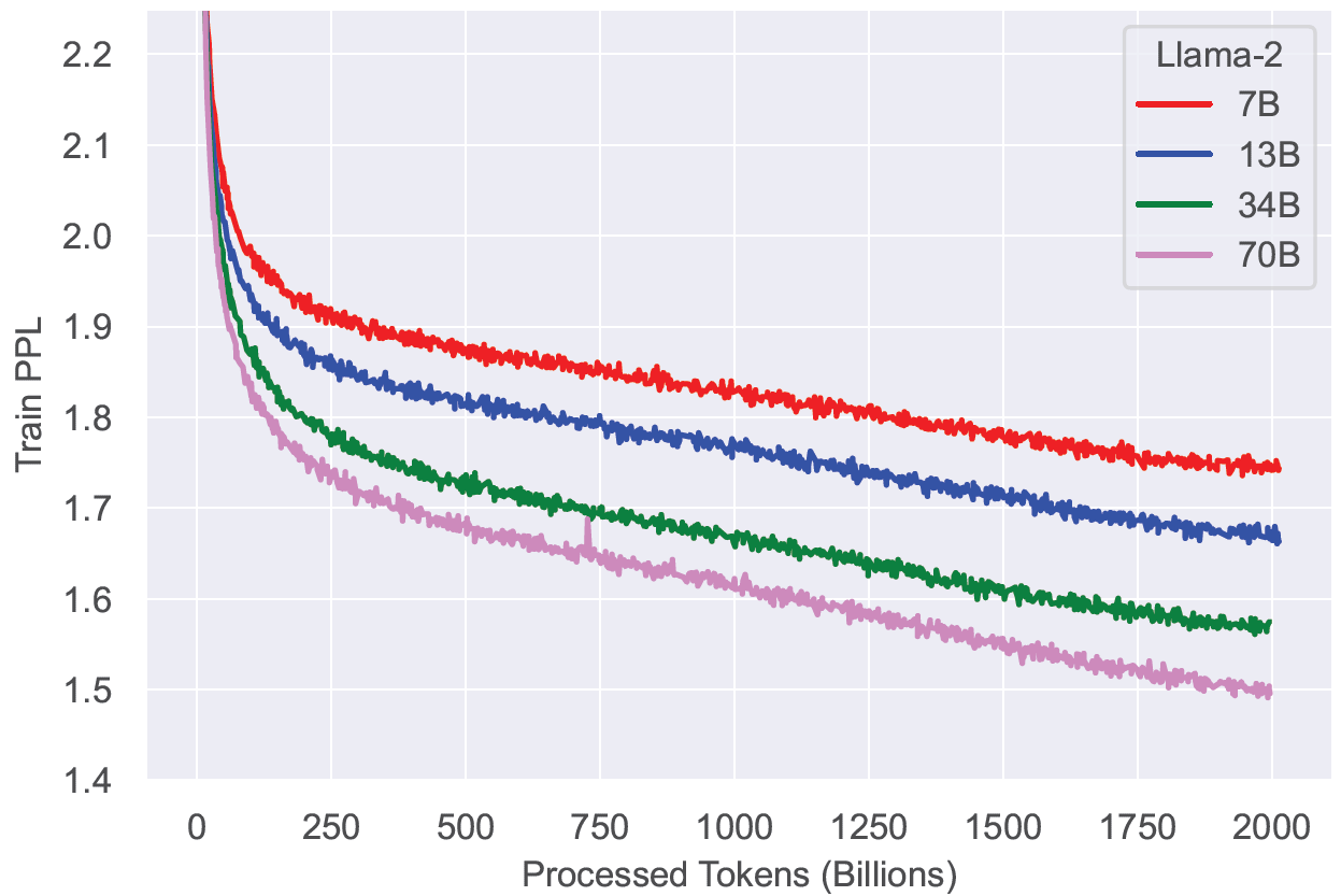 图 5:LLaMA2 Training Loss。注意即使用 2T tokens 进行训练,这些模型仍然没有饱和的迹象